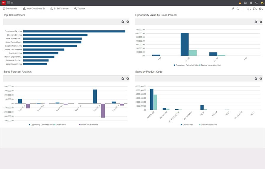Infor CloudSuite Industrial enables users to track manufacturing operations from start to finish, including financials, order entry, after-market service, and analytics. Infor CloudSuite Industrial supports advanced planning and scheduling, product configuration, materials and inventory management, customer relationship management, and role-based dashboards and analytics.