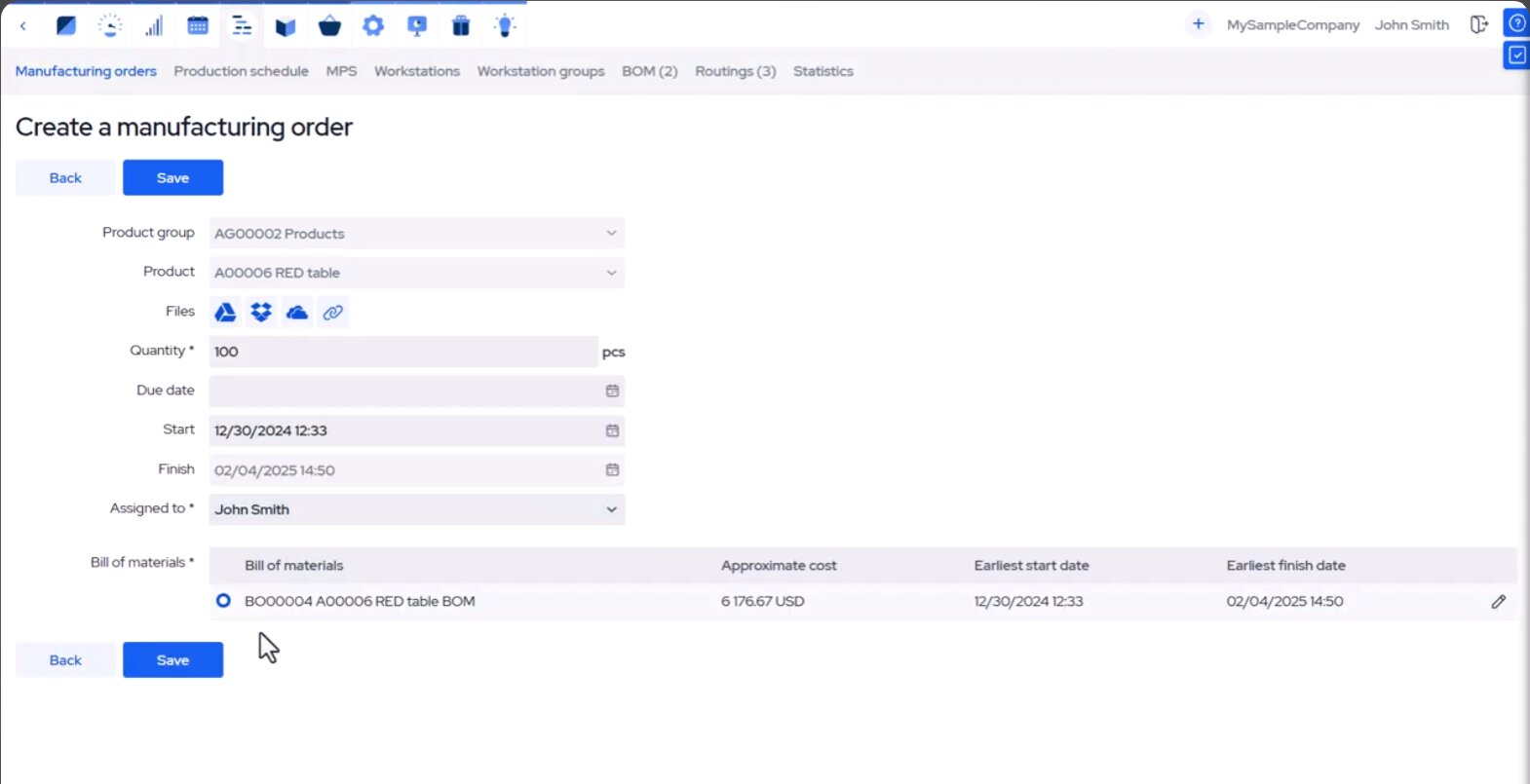 • Automated, accurate planning with a drag‑and‑drop Gantt chart and calendar lets you create realistic production schedules and reschedule on the fly by simply dragging manufacturing orders and operations.